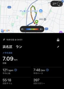 昨日の朝ランはお休み、今日は歩くようなペースからジョギングのペースとなりました。